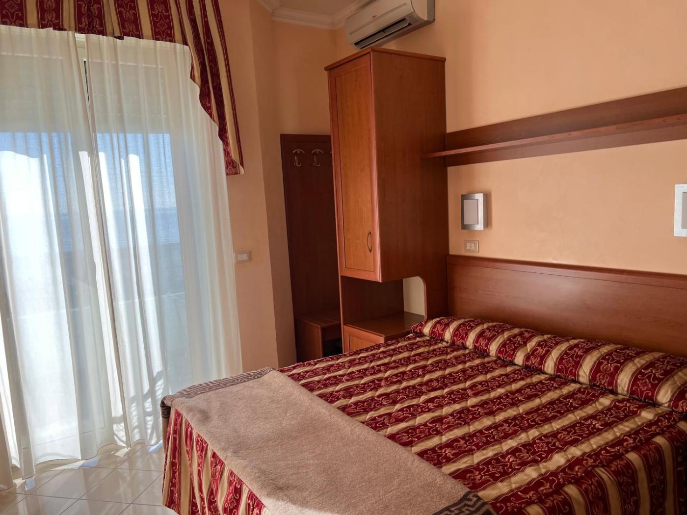 Camera Tripla Deluxe. Camera tripla climatizzata e insonorizzata, dotata di balcone con vista sul mare e bagno privato con doccia. Lalloggio dispone di 2 letti. ;
