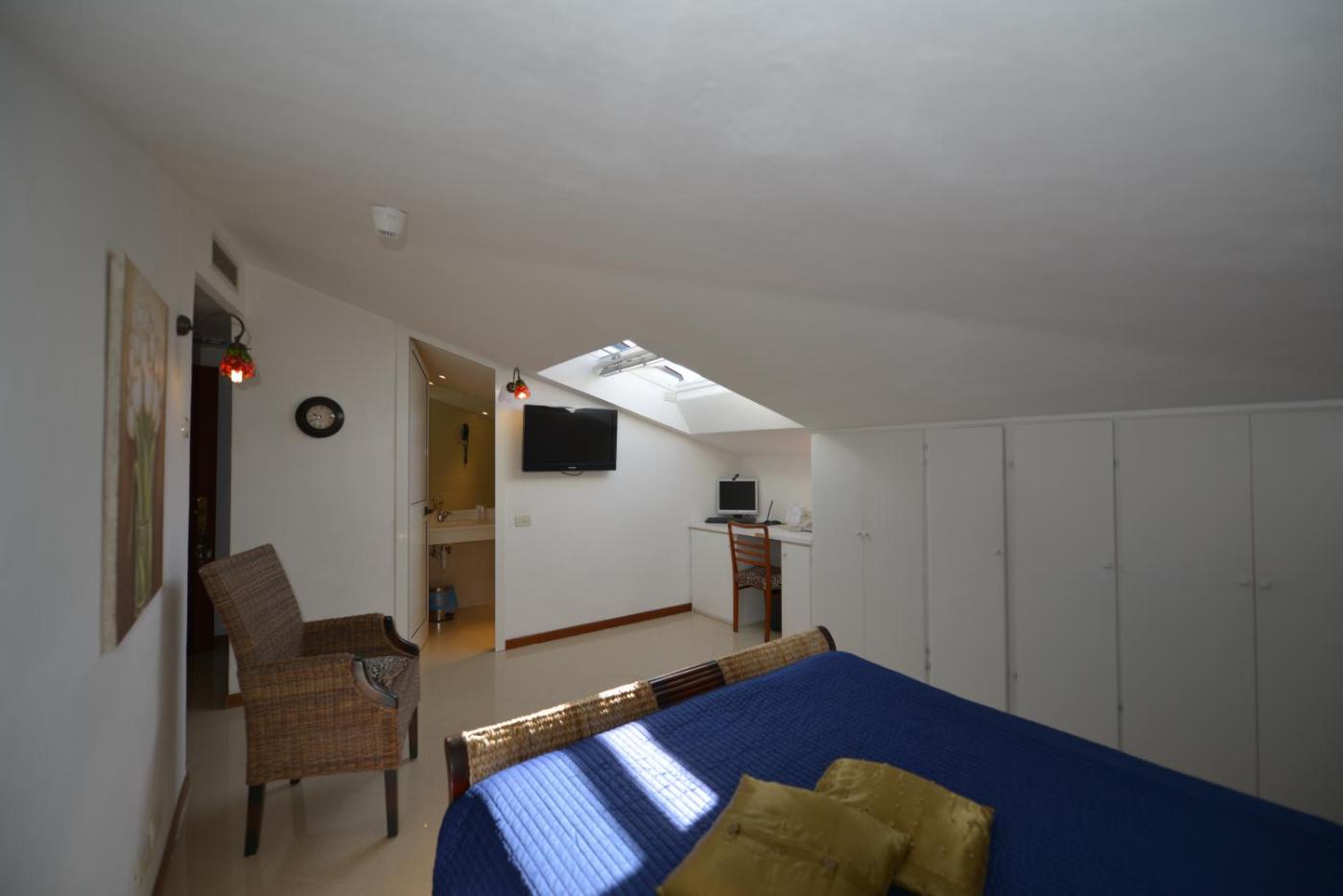Camera Matrimoniale Mansardata. Camera matrimoniale mansardata con TV satellitare, pavimento piastrellatoin marmo e minibar. ;