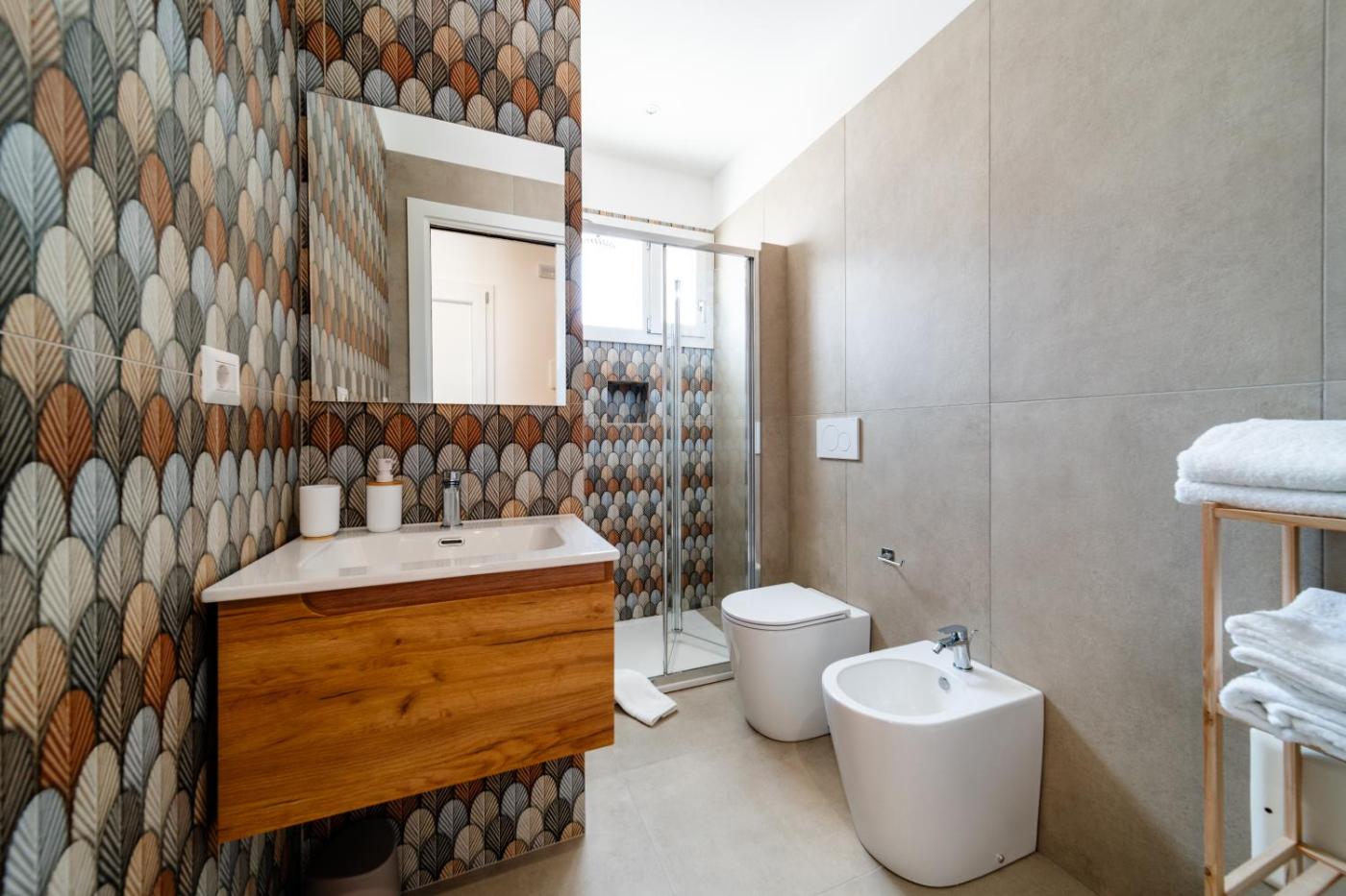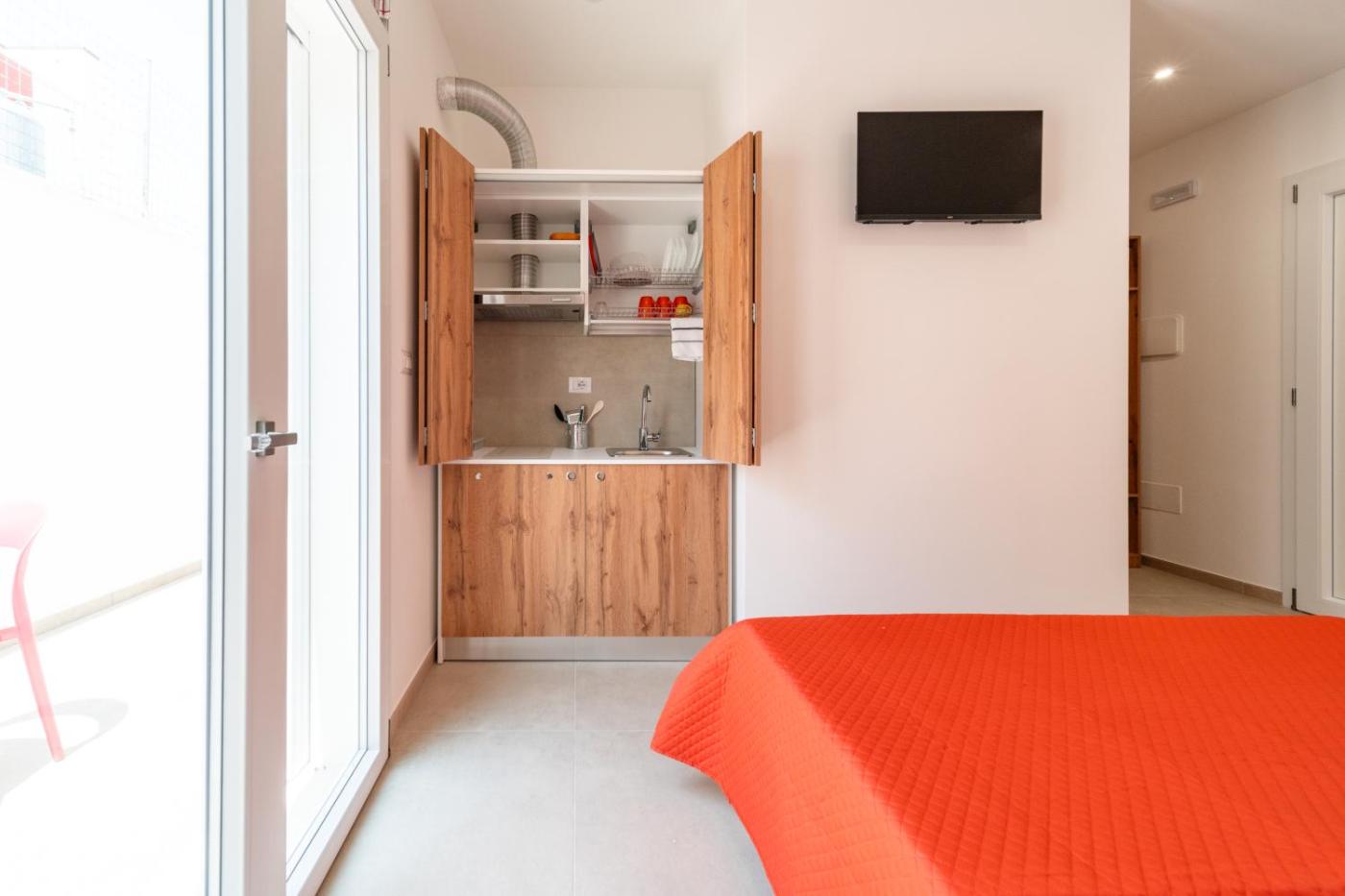 Camera Matrimoniale Deluxe con Balcone. Providing free toiletries, this double room includes a private bathroom with a shower, a bidet and a hairdryer. Meals can be prepared in the well-fitted kitchen, which is equipped with a stovetop, a refrigerator, kitchenware and a tea and coffee maker. The air-conditioned double room provides a flat-screen TV with cable channels, a washing machine, a private entrance, soundproof walls as well as ancourtyard view. The unit offers 1 bed. ;