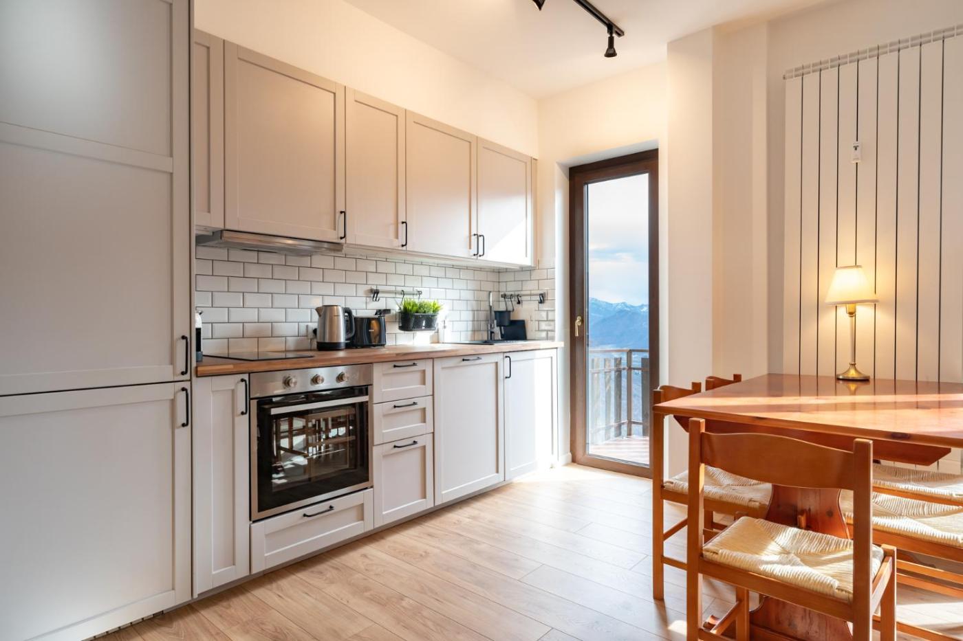 Questo appartamento prevede 2 camere da letto, 1 bagno, lenzuola, asciugamani, una TV con canali via cavo, una cucina con utensili e un balcone con la vista sulla montagna.